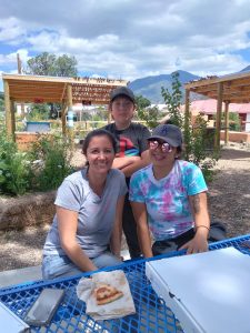 Madalena Miera, Kingston Gist-Trujillo and Desiree Martinez enjoy outdoor pizza lunch