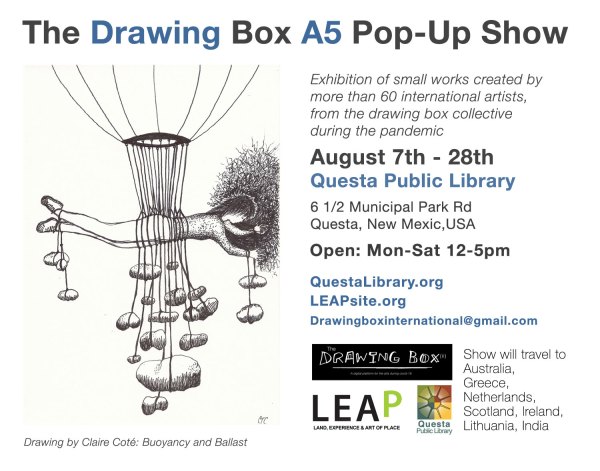 The Drawing Box A5 show is a touring exhibition of over 300 unframed works, curated by Diane Henshaw, artist and curator in Northern Ireland. The tour kicked off in Fermanagh, Northern Ireland in December 2020 and then as an online exhibition at the Galway Arts Centre. The works then began their international tour in 2021 to Paphos and Cyprus. Now the works arrive in Questa, New Mexico, the tour’s only stop in the United States and also the homeplace of participating artist and LEAP founder/director, Claire Coté. After this showing, the works continue their international exhibition journey by mail to Australia, Greece, Nètherlands, Scotland, Ireland and India.