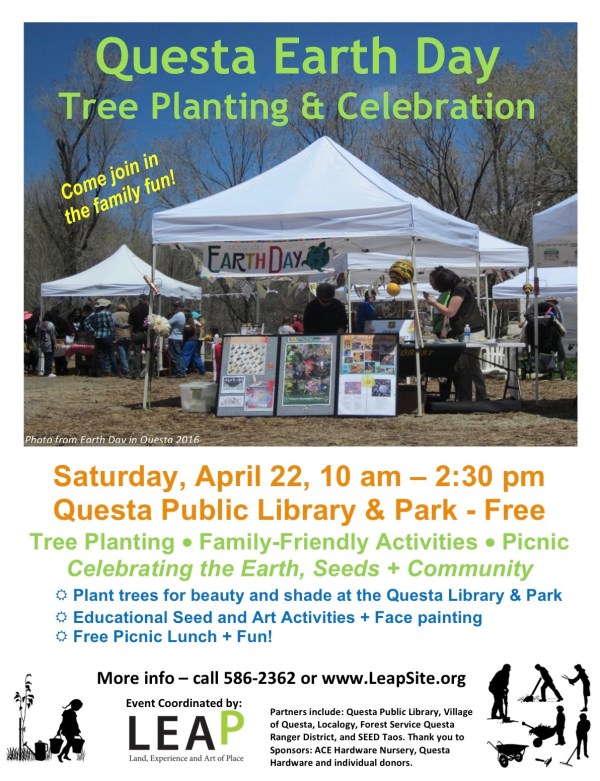 Celebrate Earth Day in Questa with Tree Planting, Seed Activities and a Picnic! In the morning, come lend a hand to plant trees and help launch the new Seed Exchange at the Questa Public Library. Explore the Seeds ~ Semillas Sensorium with special Earth Day and seed-related activities for kids and stay for burrito picnic lunch, fun music and community celebration from 12:30 – 2:30 pm. This free, outdoor event is Saturday, April 22nd, 10 am – 2:30 pm at the Questa Public Library and Park.