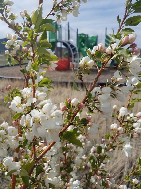 Well established flowering crabapple tree, planted at Questa Park on Earth Day 2018, photo by Claire Coté