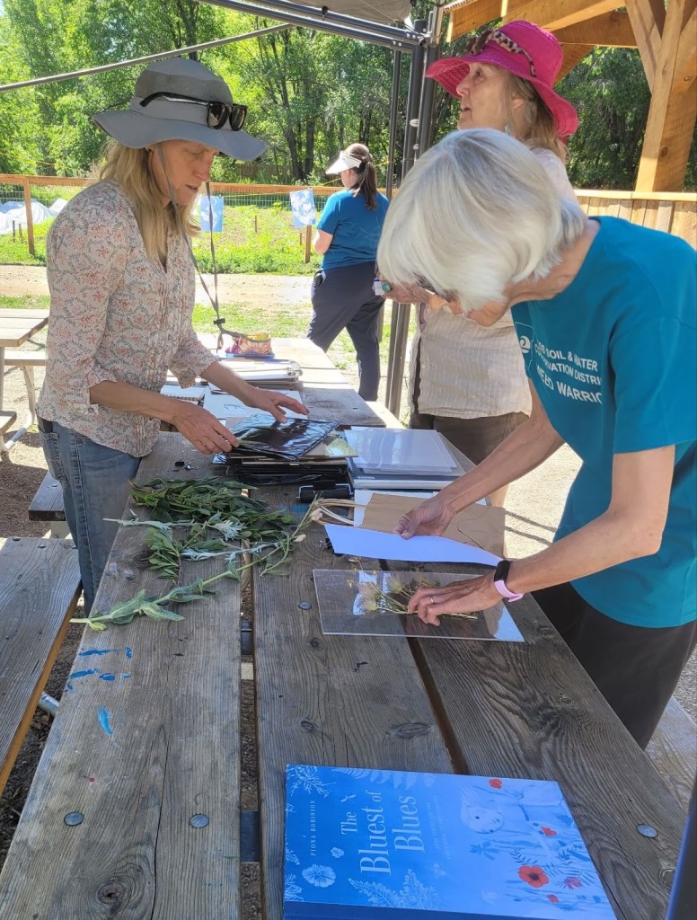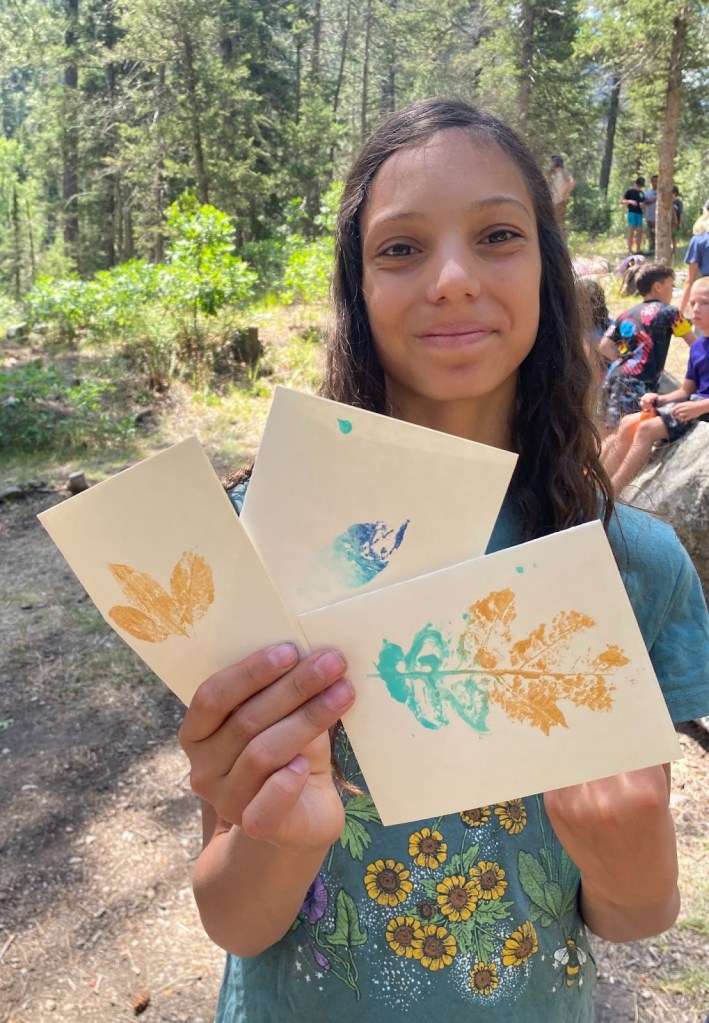 Throughout the summer, LEAP expanded its creative, nature-centered workshop offerings. At Columbine Campground, Vida Camp youth took part in a “Printing with Nature” workshop, where they learned about local plants while creating leaf prints on paper and fabric. LEAP also co-facilitated the first experimental PEAR Workshop Series (People and Plants, Education and Environment, Art and Restoration) organized by Maggie Gaddis, Executive Director of the Colorado Native Plant Society, and Lee Lee of the historic Taos Distillery, an emerging arts-and-ecology initiative. As part of PEAR, LEAP hosted a plein-air art day at the Taos Land Trust, where volunteers from the Taos Chapter of the Native Plant Society of New Mexico developed plant cyanotypes, printed leaves and flowers and sketched botanical shadows, surrounded by the species they help protect and promote.