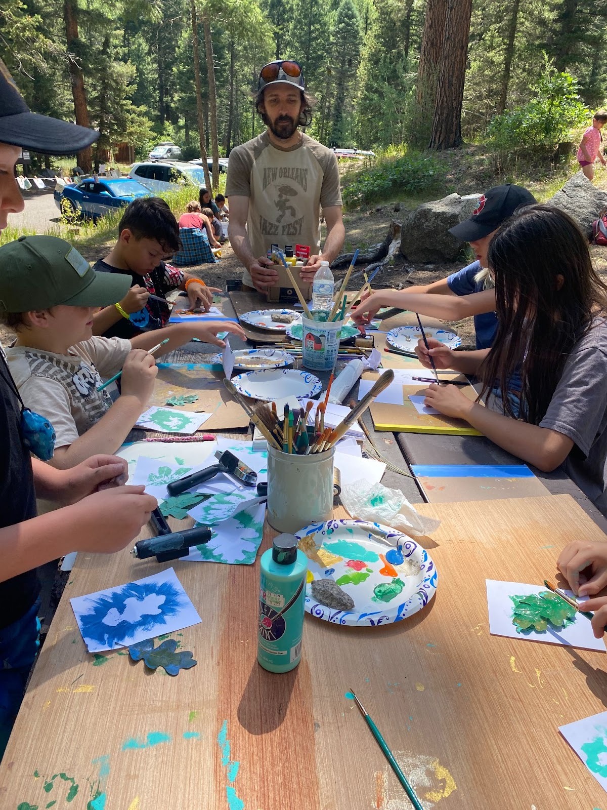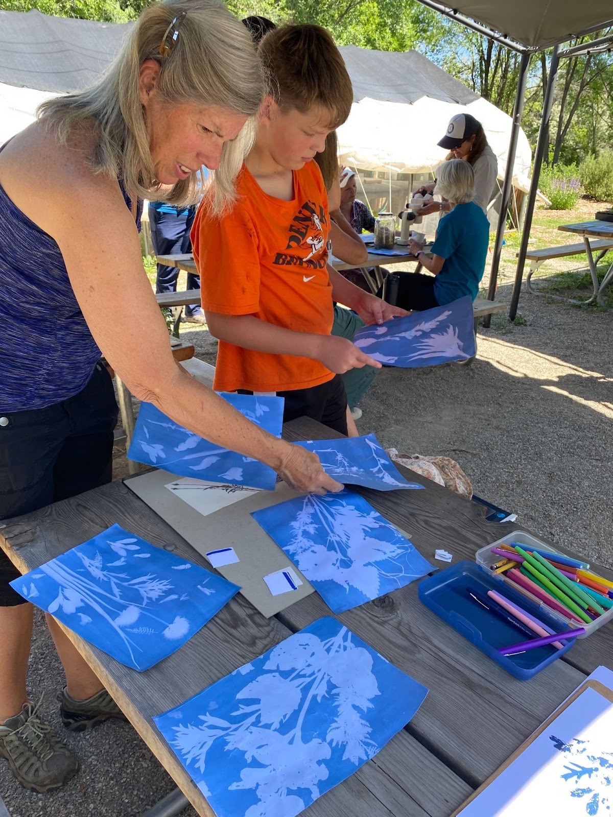Throughout the summer, LEAP expanded its creative, nature-centered workshop offerings. At Columbine Campground, Vida Camp youth took part in a “Printing with Nature” workshop, where they learned about local plants while creating leaf prints on paper and fabric. LEAP also co-facilitated the first experimental PEAR Workshop Series (People and Plants, Education and Environment, Art and Restoration) organized by Maggie Gaddis, Executive Director of the Colorado Native Plant Society, and Lee Lee of the historic Taos Distillery, an emerging arts-and-ecology initiative. As part of PEAR, LEAP hosted a plein-air art day at the Taos Land Trust, where volunteers from the Taos Chapter of the Native Plant Society of New Mexico developed plant cyanotypes, printed leaves and flowers and sketched botanical shadows, surrounded by the species they help protect and promote.