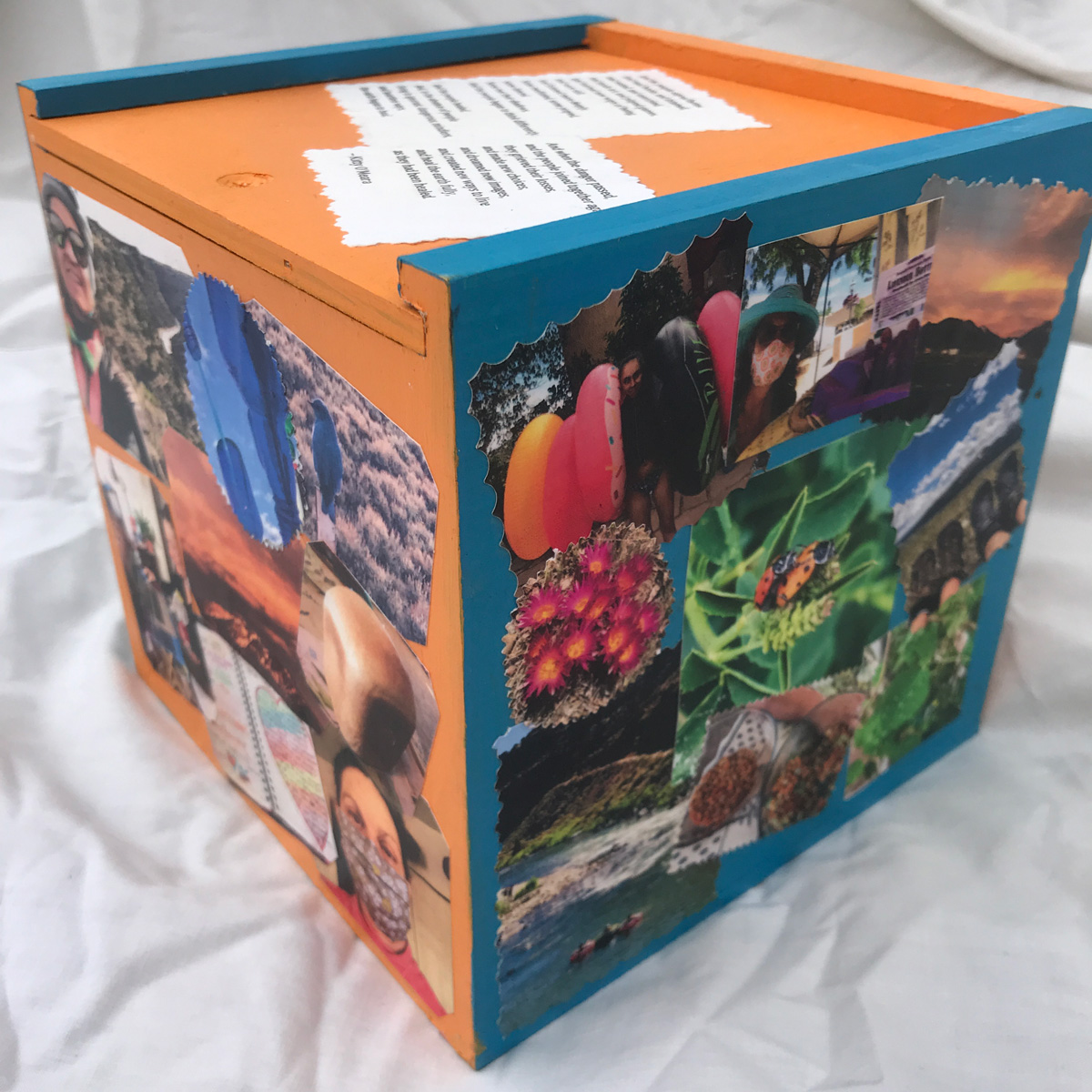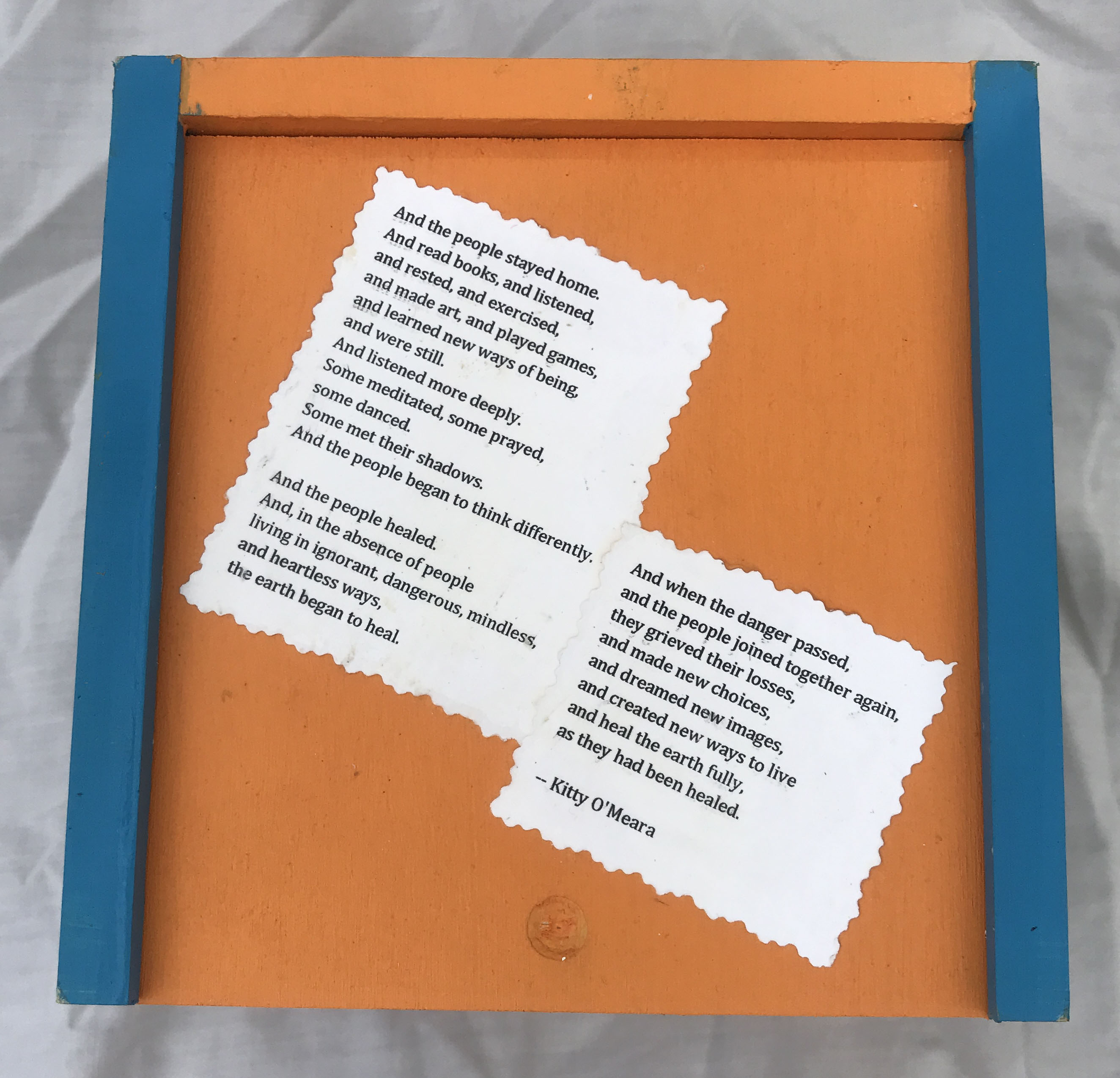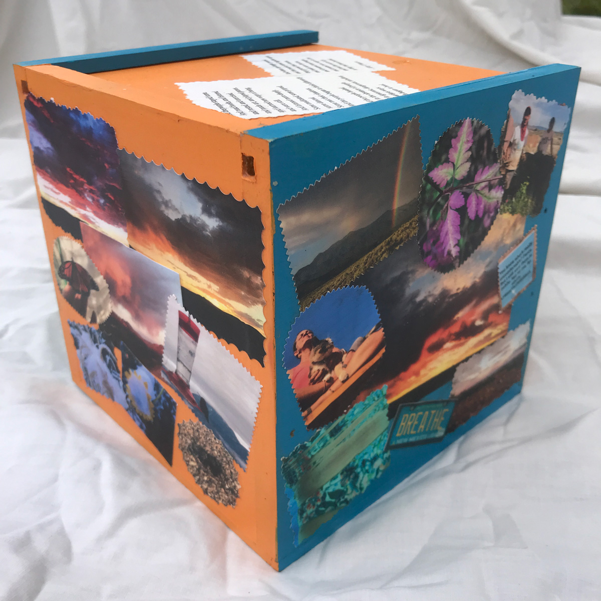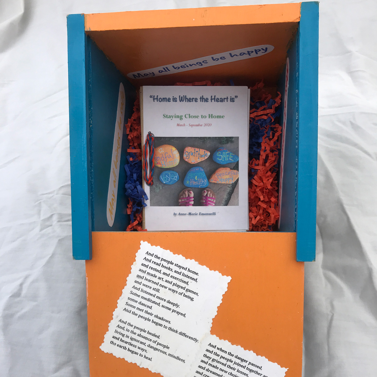 The imagery on my box represents this greater concept of “home” beyond the confines of the house in which we live. Each panel is a span of time: March/April; May/June; July/August, and September. The collaged images are examples of what “being home” has meant to me. The poem on the lid was written by a teacher and went viral during the early lockdown period. Inside the box are Mettá (loving kindness) phrases that have helped me get through the anxiety of these six months. The booklet is created from journal pages generated during hours of self-reflection listening to meditation teachers who explained what we were collectively going through.