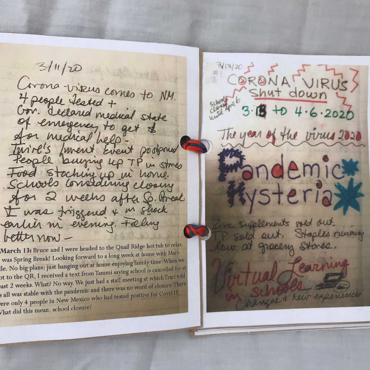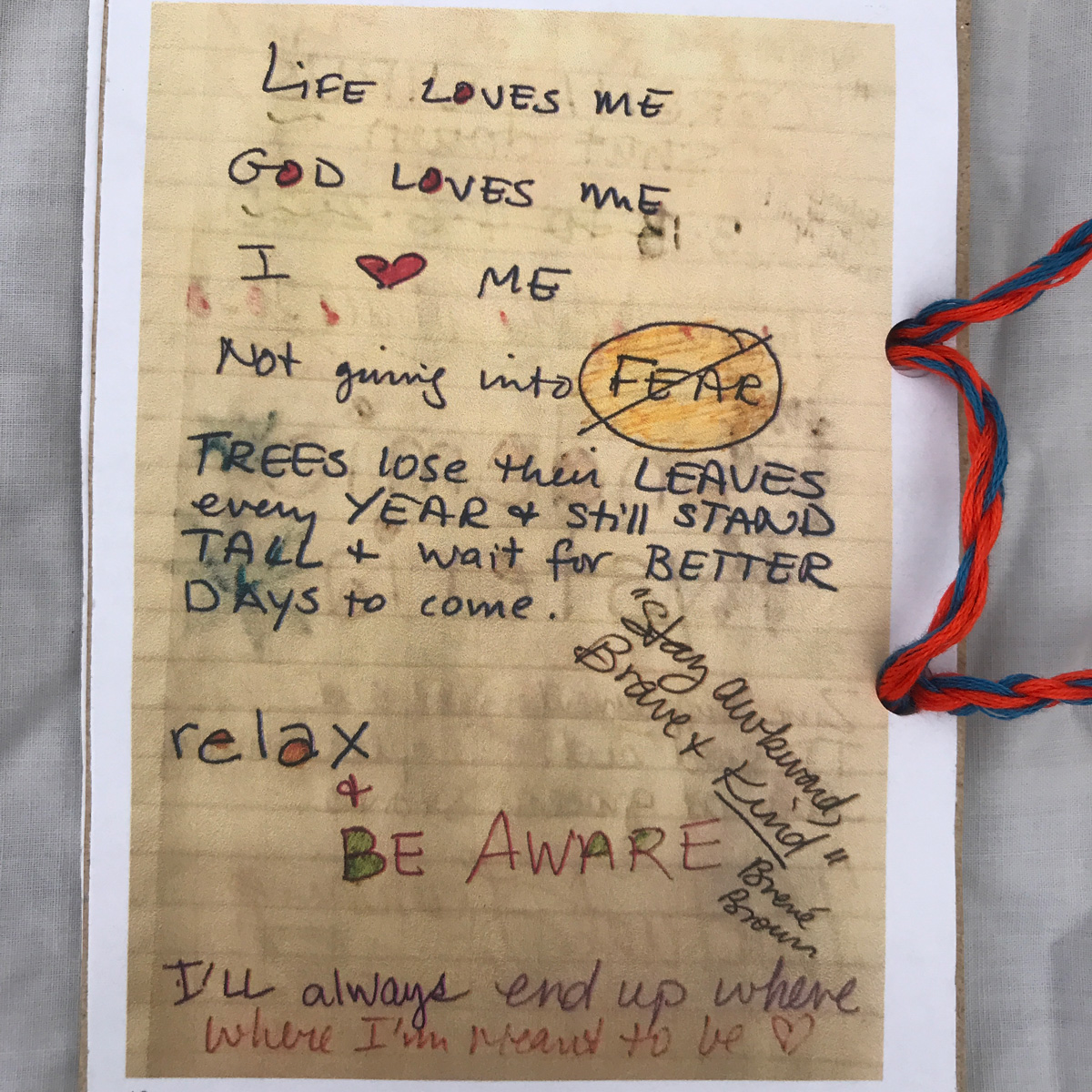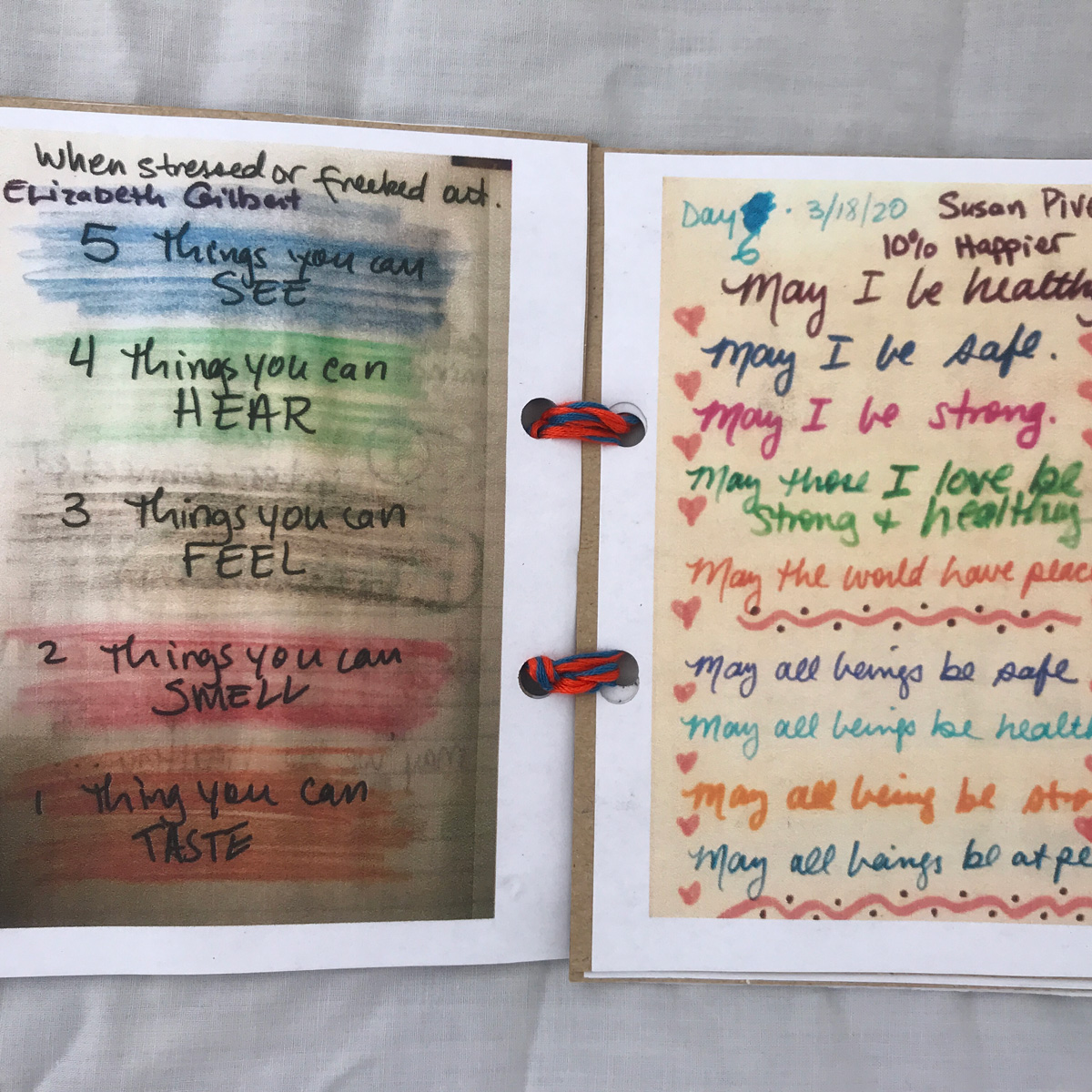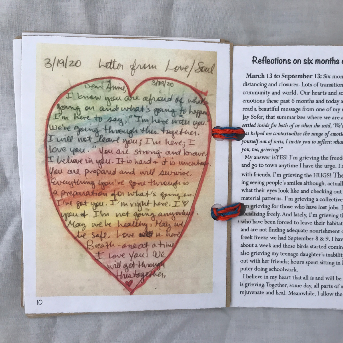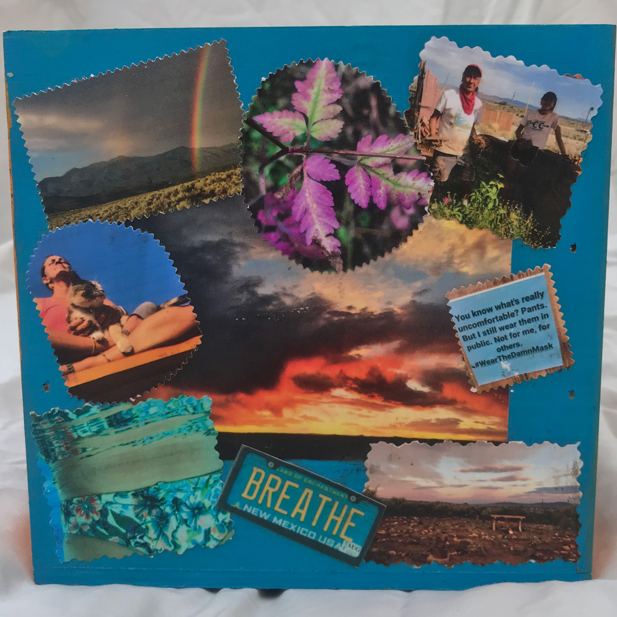The imagery on my box represents this greater concept of “home” beyond the confines of the house in which we live. Each panel is a span of time: March/April; May/June; July/August, and September. The collaged images are examples of what “being home” has meant to me. The poem on the lid was written by a teacher and went viral during the early lockdown period. Inside the box are Mettá (loving kindness) phrases that have helped me get through the anxiety of these six months. The booklet is created from journal pages generated during hours of self-reflection listening to meditation teachers who explained what we were collectively going through.