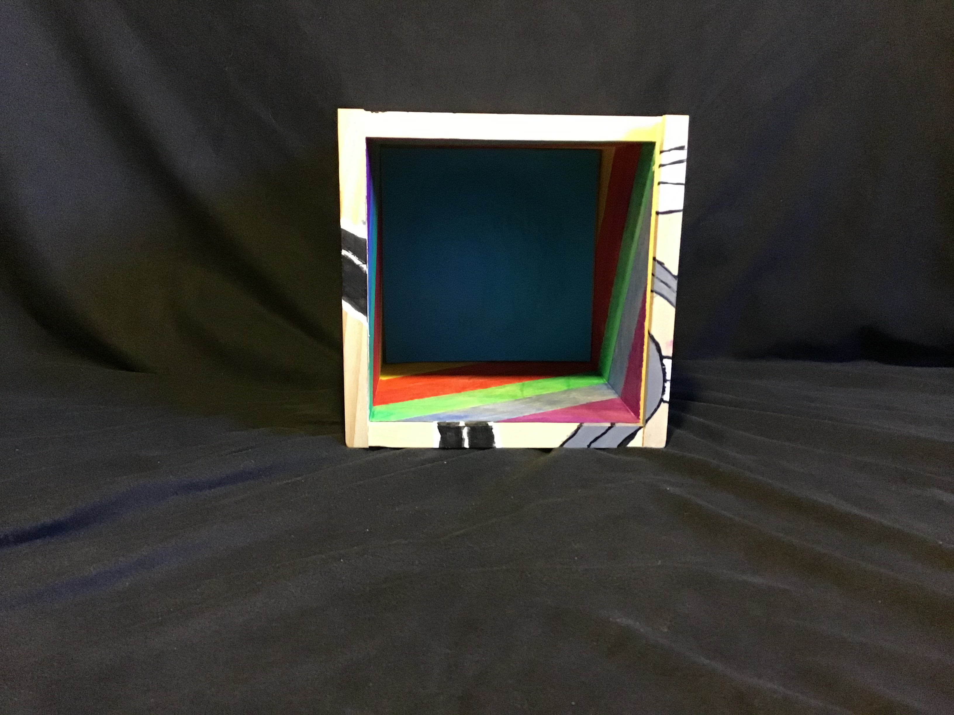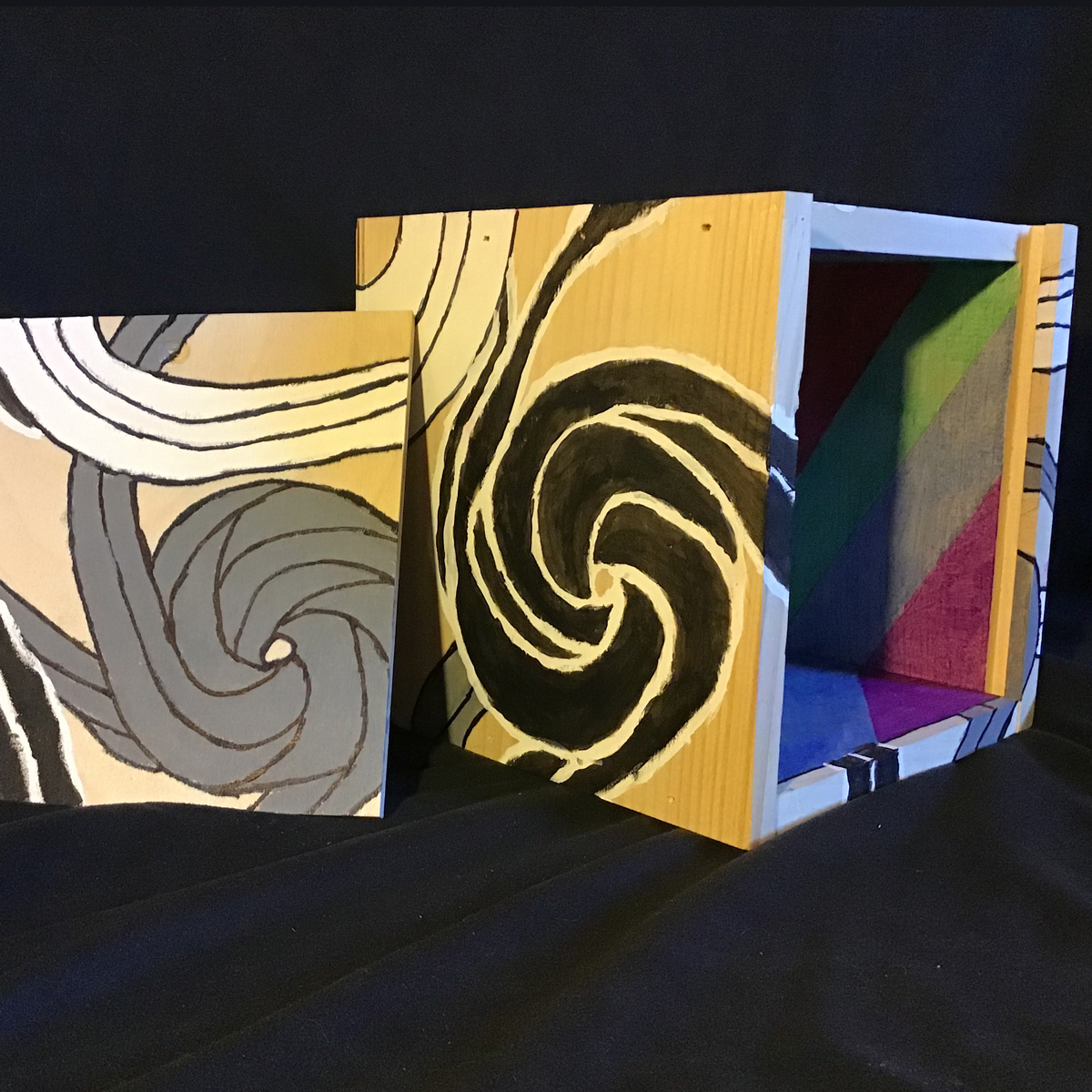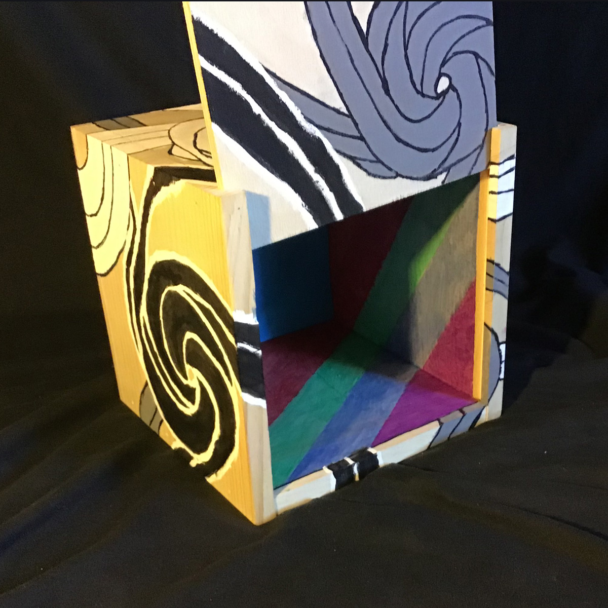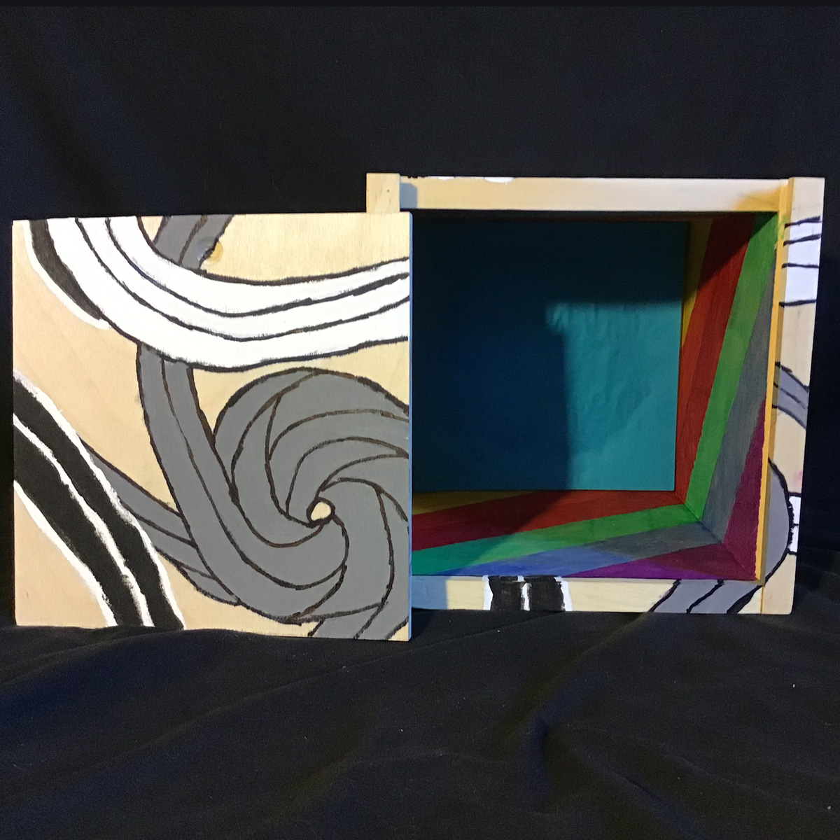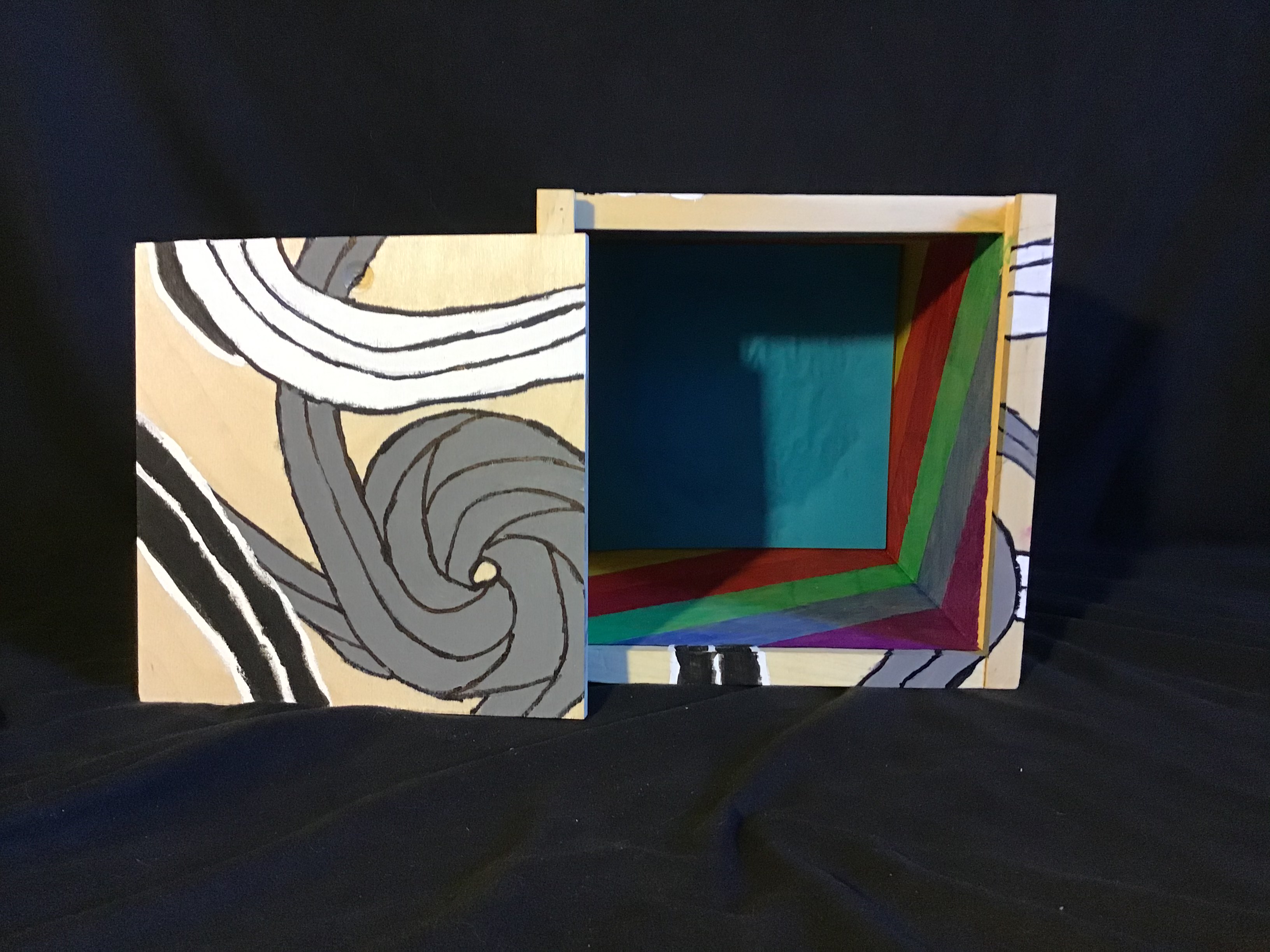 My idea for my box came from how confused and contained people’s happiness is right now so on the outside of my box I drew confusing swirls and colored them with dark colors like gray black and white. And on the inside you will open it and you will see a blast of color such as red orange green purple yellow.and that represents the happiness that is hidden inside everyone we just need to find it underneath all the darkness of the world.