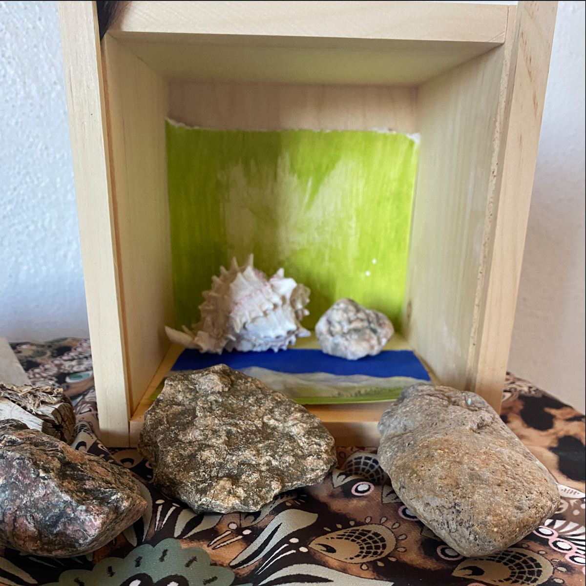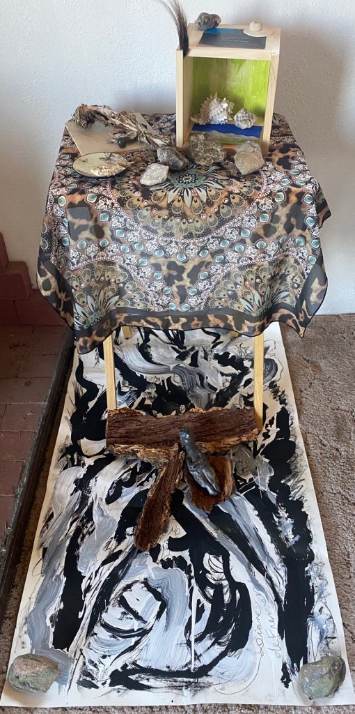 It is an assemblage of collected items that were either sent to me for inspiration or gathered by me during these stressful times. These are rocks sticks and shells picked up on my many walks around my property and across the stream. I also included a painting I did representing angst. This was done at a class with Sas Colby at the Mabel Dodge Luhan House when I still worked there.