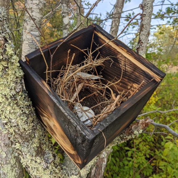 We burned the box, then placed a nest inside. While the bird was resourceful with the available materials, it made us sad to think of the synthetic material that made up this home for birds and reminds us that modern human construction of homes often consists of chemically laden, synthetic material. Within the nest are a pair of pine eggs, painted by Thatcher Gray, along with a marble egg. It reminded us of the birds who lay their eggs in other birds’ nests, then flies off to sap the resources from the unwillingly adopted parents. We photographed it in a Hawthorn tree, which was the other species decimated from the landscape. The trees were harvested for their long thorns, which were used as nails in ship construction. These nails wouldn’t rot in the salt heavy air like iron nails did. While we were burning the box, Carol Dana, who was visiting from Indian Island, made the comment that the burning reminded her of the mega-fires out west. The fires that sent out a smoky haze that we could see even here in Maine. Her comment tossed me back to the west, the area we do consider HOME.